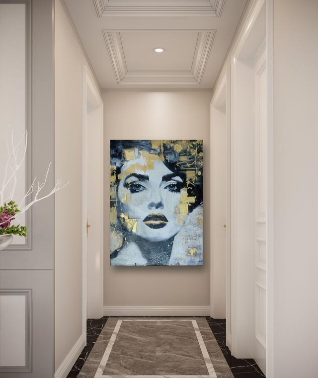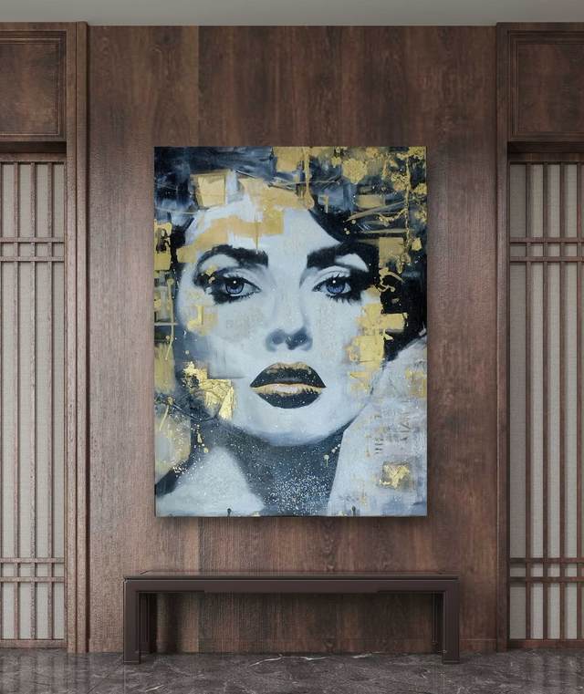 This artwork by Fez, pays homage to the legendary Blondie, executed in a unique blend of materials and techniques. Using 24 and 23.75 karat gold leaf, 24-karat gold paint, platinum leaf, 100% silk embroideries and fabrics, rhodium leaf bronze shavings, gilded shavings, diamond shavings, and raw and crushed diamonds, it exudes unparalleled allure. Each of the 10 pieces in this limited series is unique, with variations in details arising from the use of different techniques. The paint spontaneously finds its way across the canvas, giving each piece its own story.